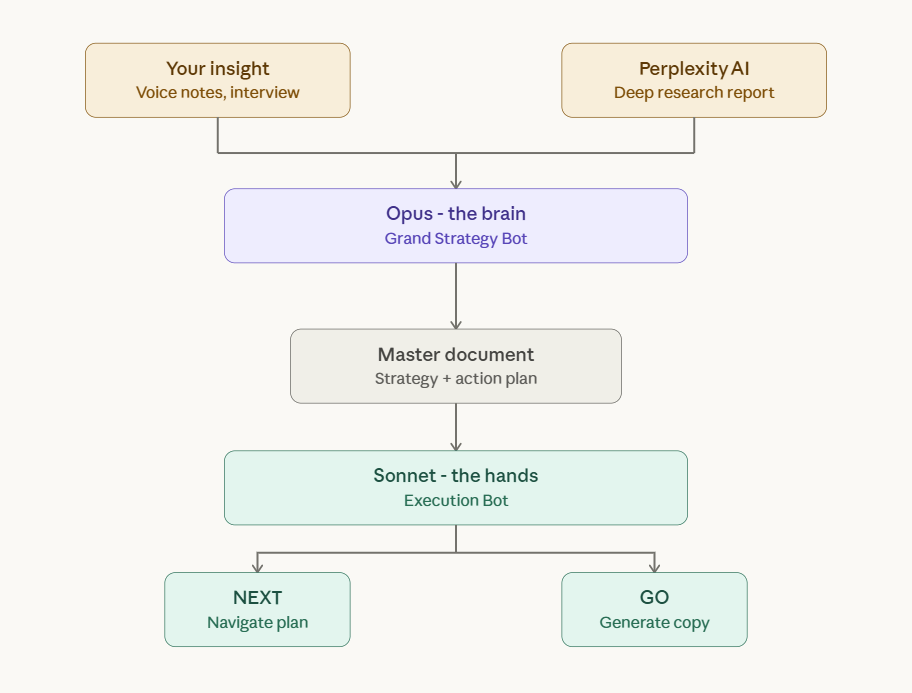 On top of this master document, which will act as the first and final brief, you can prompt the Grand Strategy Bot to create a script with commands that activates a second executor chat – the Sonnet chat – that is set up to help you realise the objectives of the grand strategy.