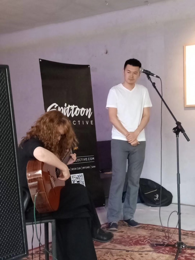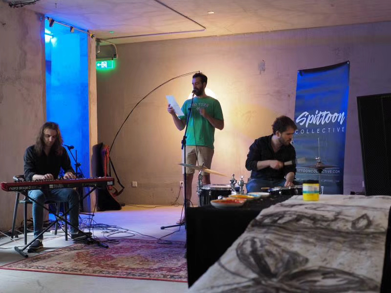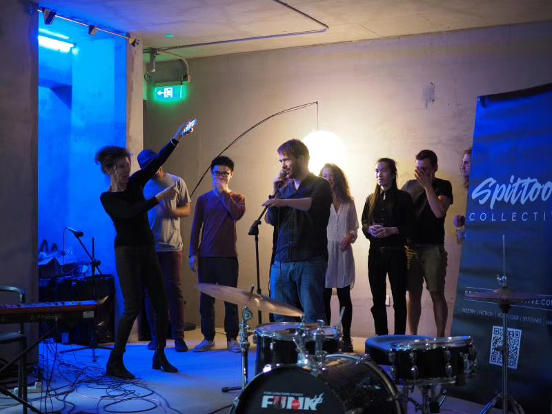 A fusion of prog-rock and jazzy-Latin sound tracking with original music, accompanying spontaneous poetic prose written and performed in Spanish by Jaime Santirso. Matthew Byrne, Spittoon’s founder, performed as poet alongside David Bond on keys. Bond has been active in the Chinese music industry since 2010, performing and recording with acts including Feixu, Demerit, and Peking Floyd. Santirso, born in Gijón in 1990, published his debut collection Encuentro in 2018 and has reported on international politics for RNE, Spanish national radio.