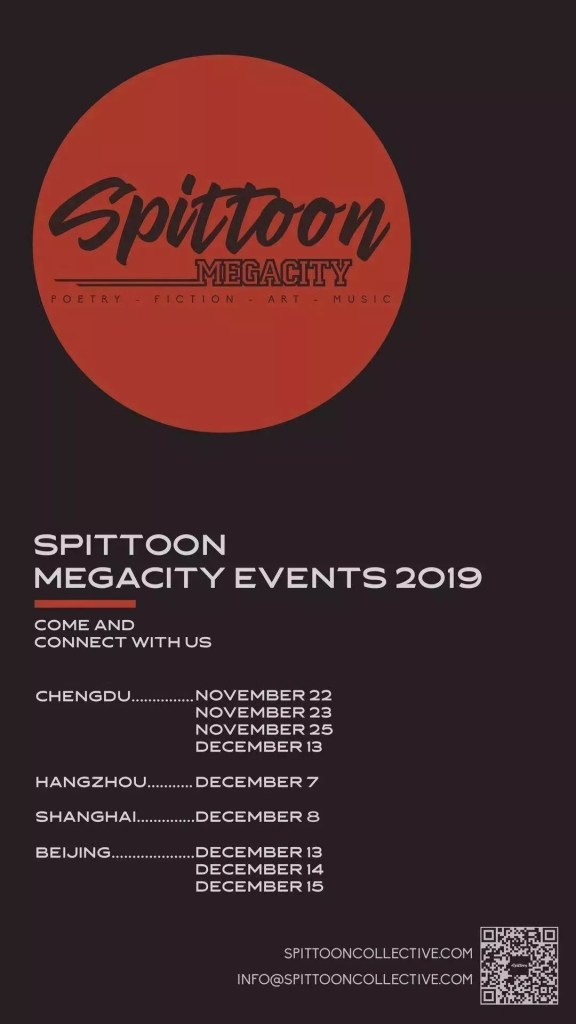 December 15 — DDC, 山老胡同14号 Spittoon Literary Magazine Issue 6 Launch, 3pm to 5pm Spittoon Megacity Stage: Fiction and Poetry, 5pm to 7pm Spittunes: Poetry and Music Collaboration, 8:30pm to 11pm